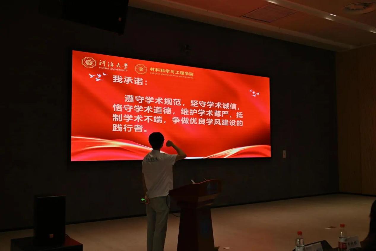 2024级硕士研究生新生沈忱作为新生代表发言,并带领全体学生进行学术诚信宣誓。沈忱同学在发言中表达了自己对未来学习生活的美好期望,并以“博学而笃志”为座右铭,希望大家都能成为具有“中国灵魂、全球视野、河海特质”的新时代河海人。