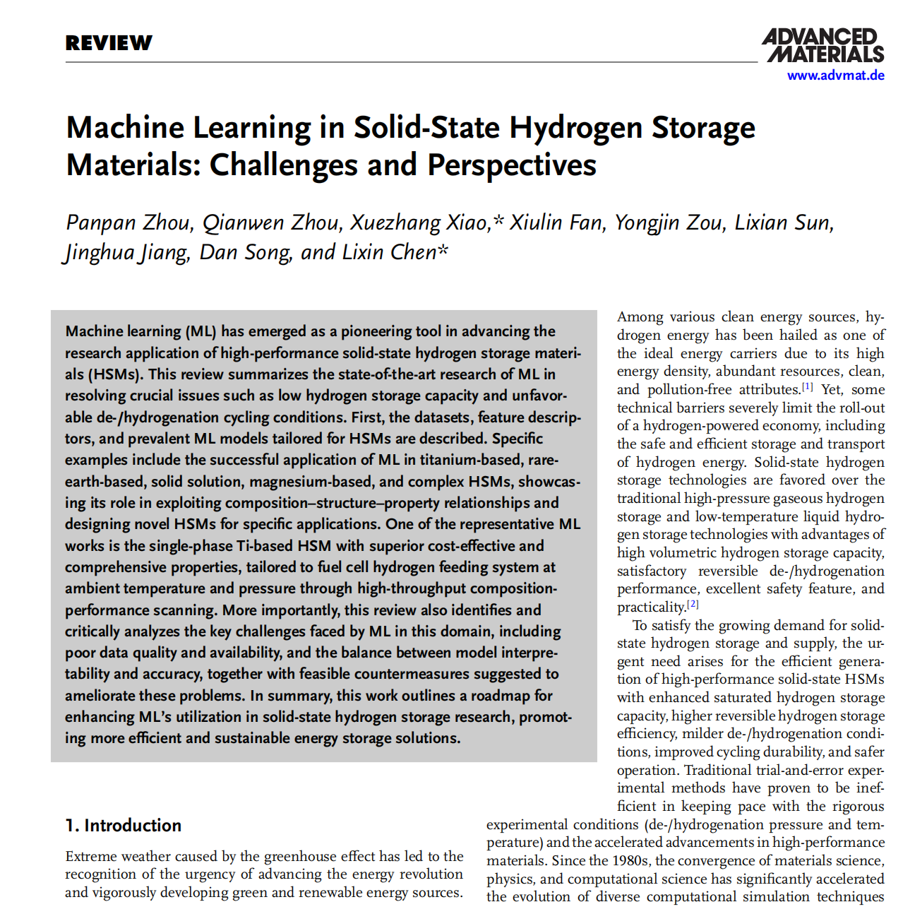 近日,我院青年教师周盼盼以第一作者身份在材料领域顶级期刊《Advanced Materials》上发表了题为“Machine Learning in Solid-State Hydrogen Storage Materials: Challenges and Perspectives”的综述长文(非邀稿),河海大学为第一单位,浙江大学陈立新教授和肖学章教授为论文的共同通讯作者。(https://doi.org/10.1002/adma.202413430)