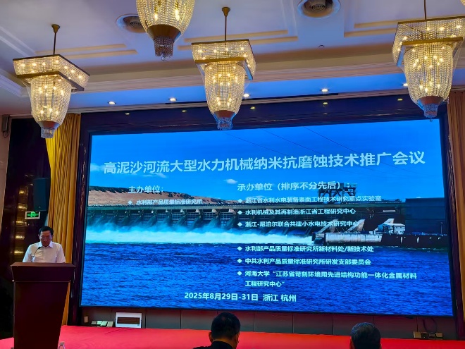2025年8月29日- 30日,由水利部产品质量标准研究所主办的“高泥沙河流大型水力机械纳米抗磨蚀技术推广会议”在浙江杭州举行,我院“江苏省苛刻环境用先进结构功能一体化金属材料工程研究中心”与浙江省水利水电装备表面工程技术研究重点实验室等多家单位联合承办。